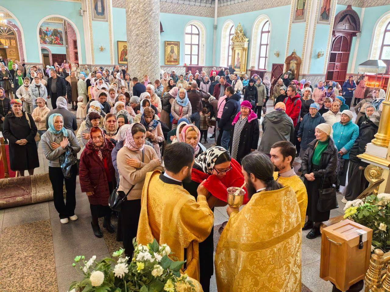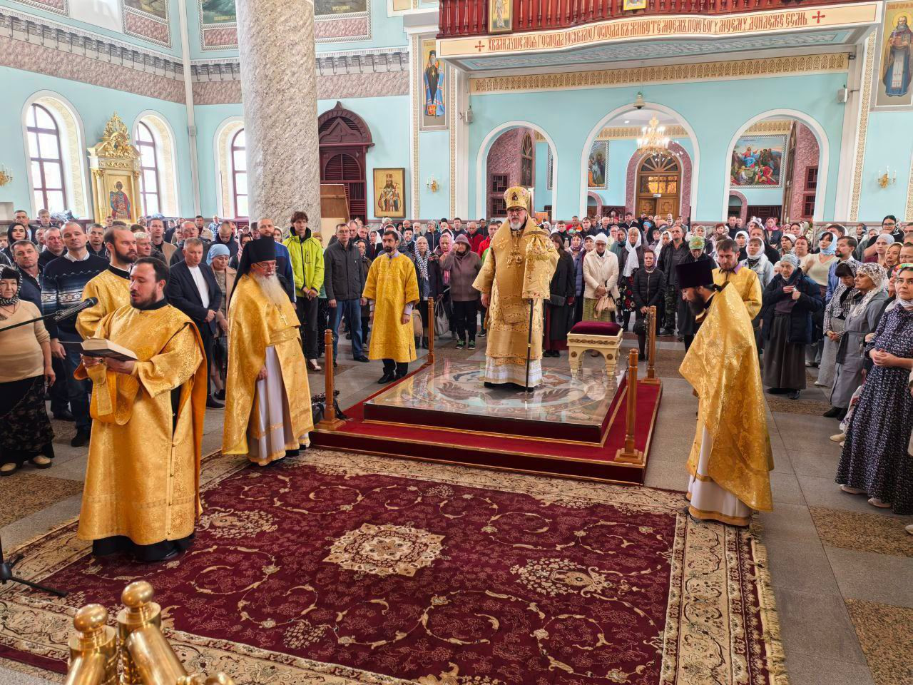 7 сентября 2025 года, неделя 13-я по Пятидесятнице. Перенесение мощей ап. Варфоломе?я. Ап. от 70-ти Ти?та, еп. Критского. Прмч. Моисе?я Кожина Солове?цкого. Митрополит Читинский и Петровск-Забайкальский Димитрий возглавил Божественную литургию в кафедральном соборе Казанской иконы Божией Матери города Читы.