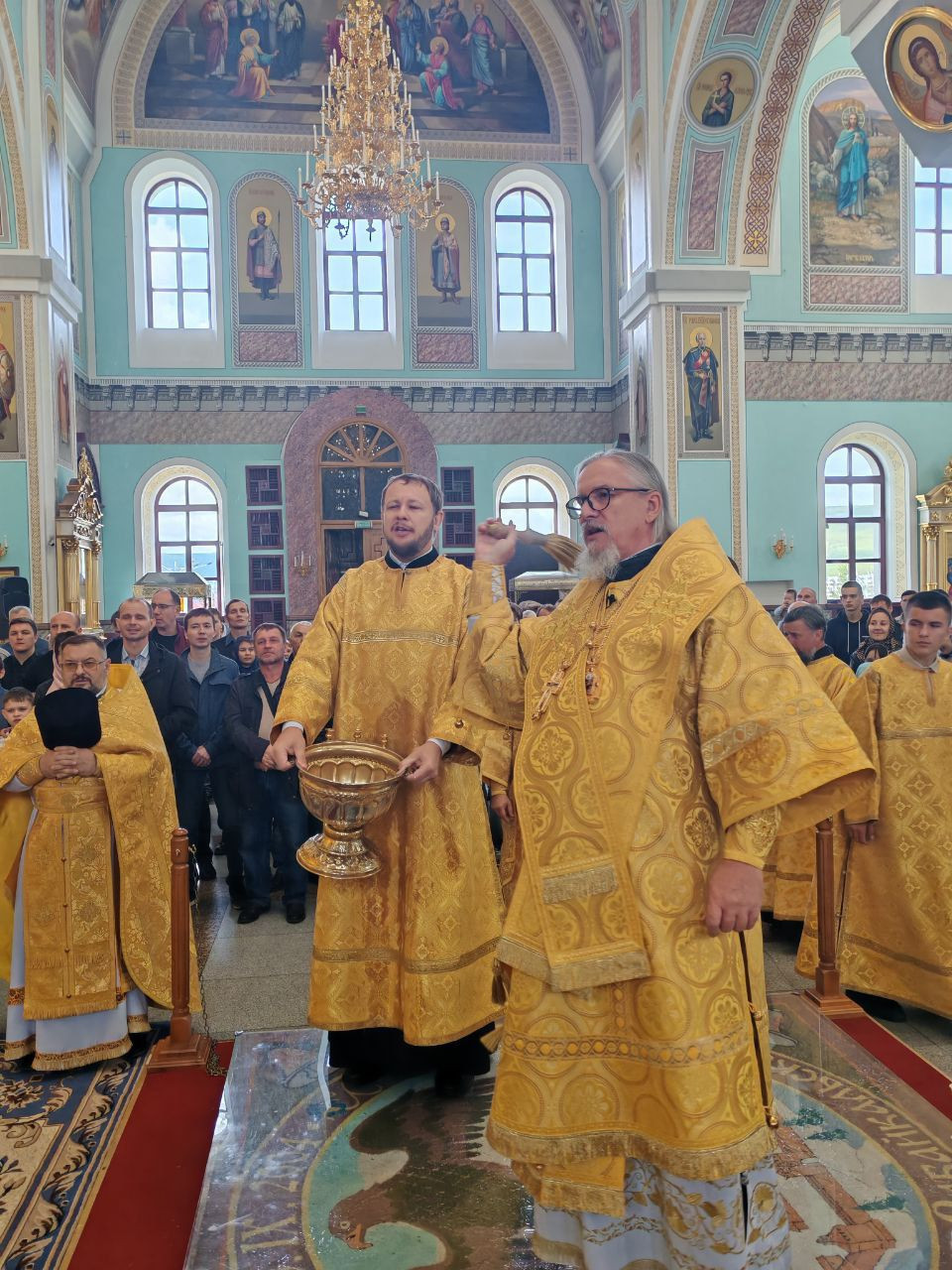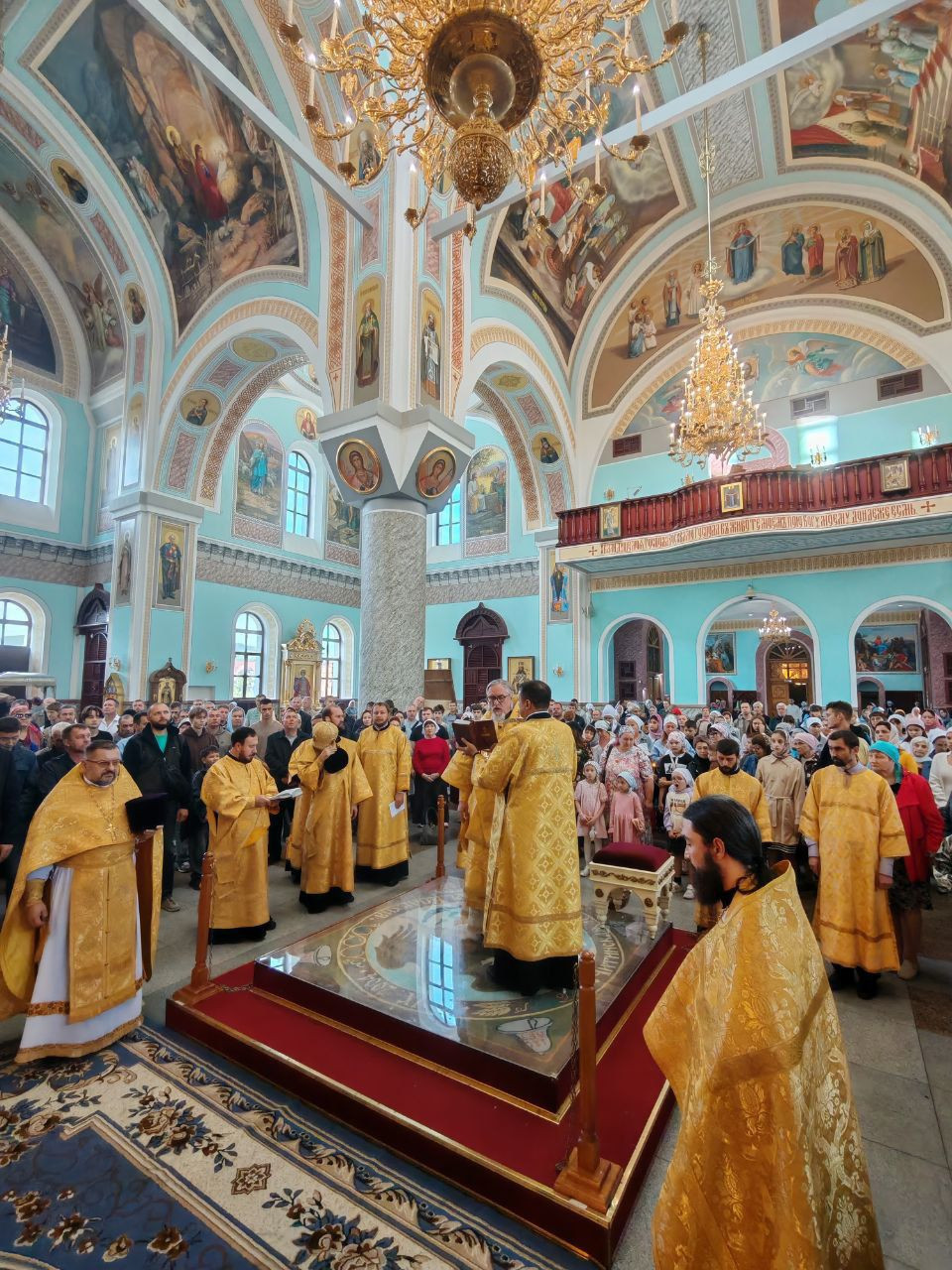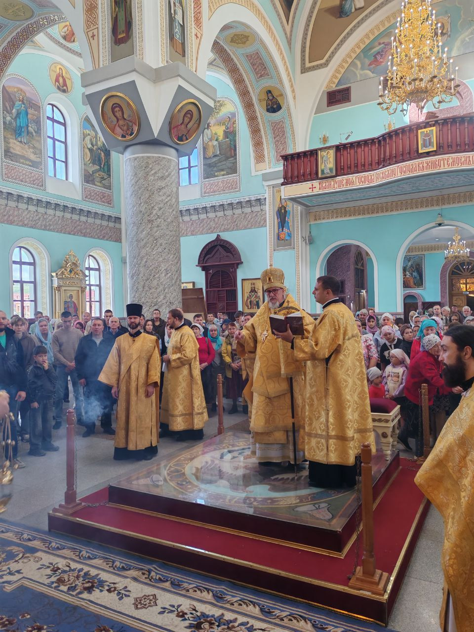 31 августа 2025 года, неделя 12-я по Пятидесятнице. Попразднство Успения Пресвятой Богородицы. Мчч. Фло?ра и Ла?вра. Иконы Божией Матери, именуемой «Всецари?ца», митрополит Читинский и Петровск-Забайкальский Димитрий совершил Божественную литургию в Казанском кафедральном соборе города Читы.