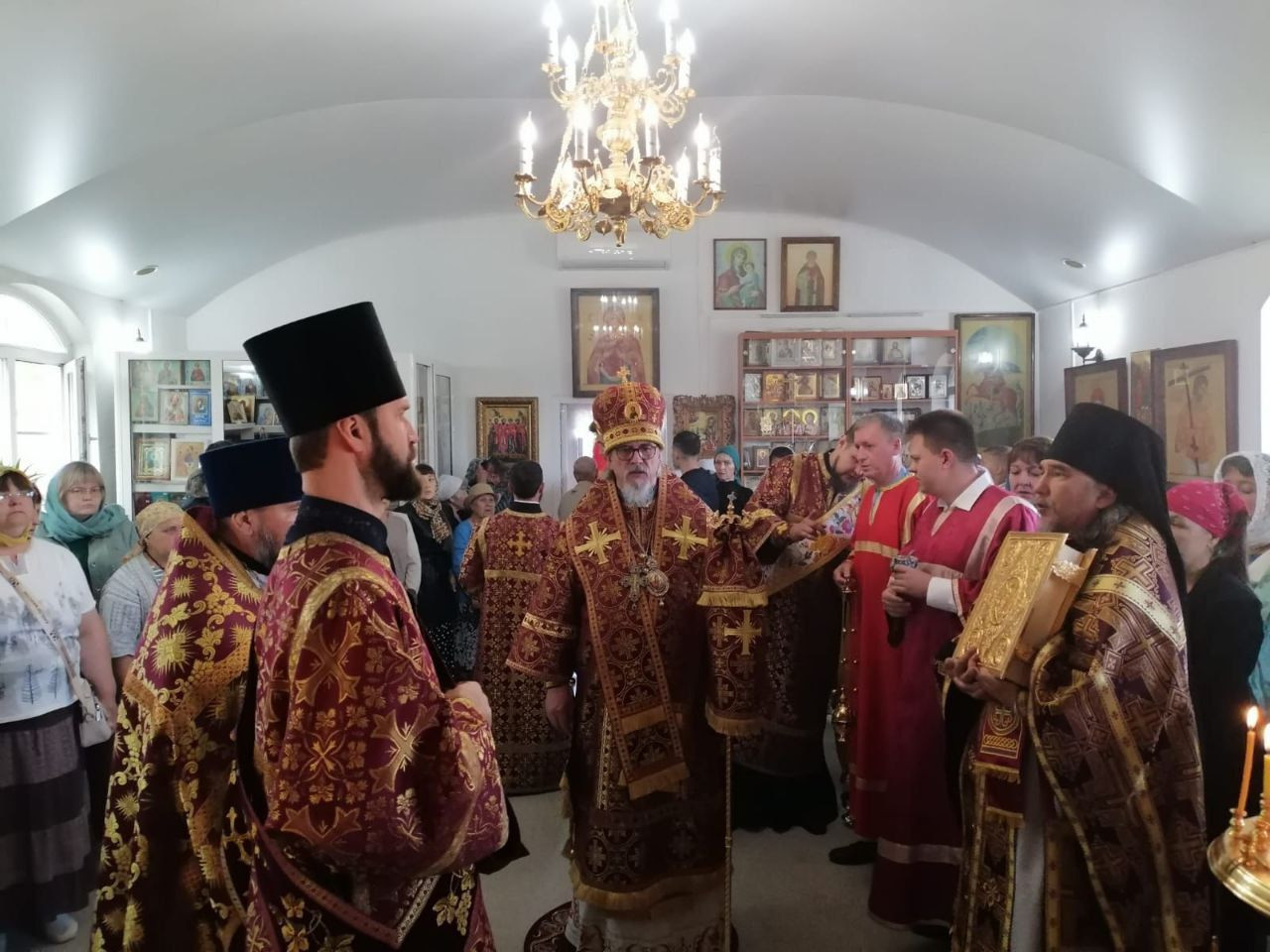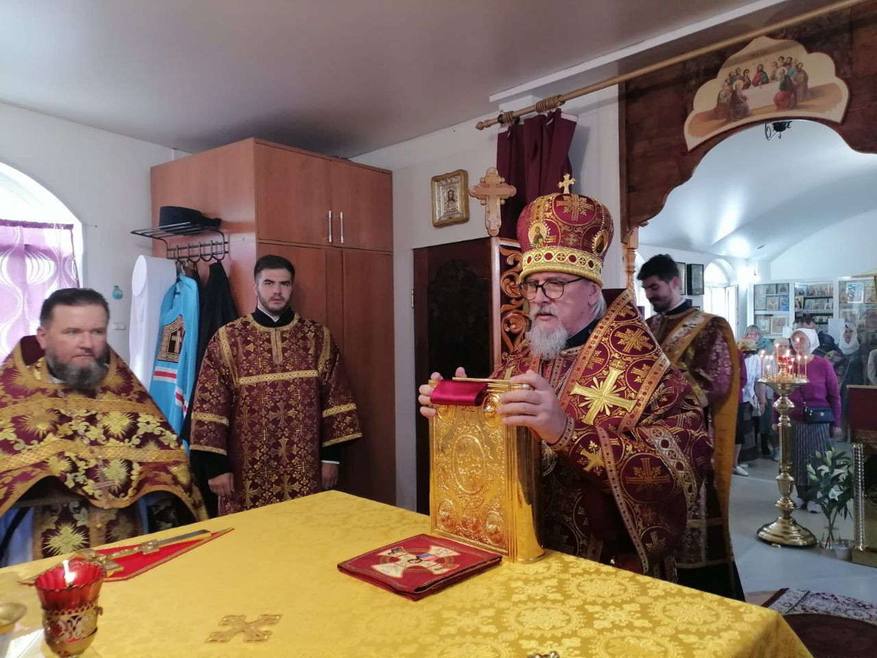 Его Высокопреосвященству сослужили благочинный 3-го Читинского округа иеромонах Варлаам (Попов) и настоятель храма Воскресения Креста Господня иерей Алексей Янковский.