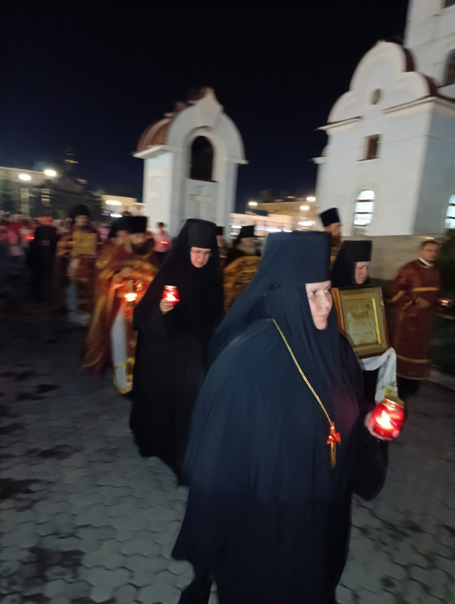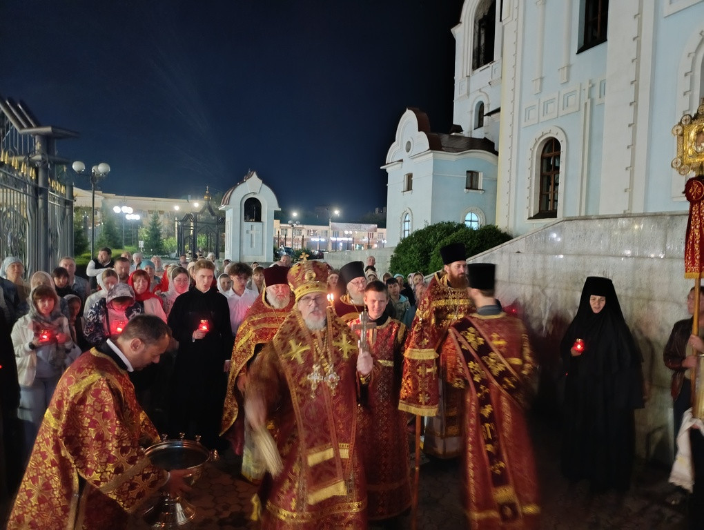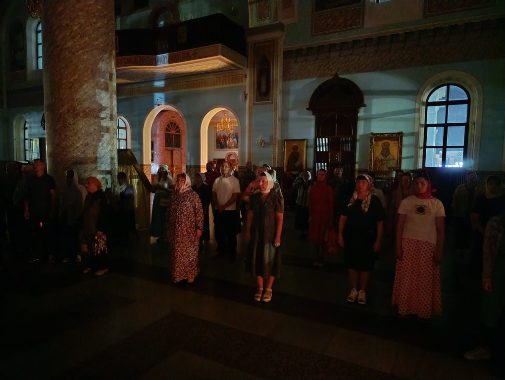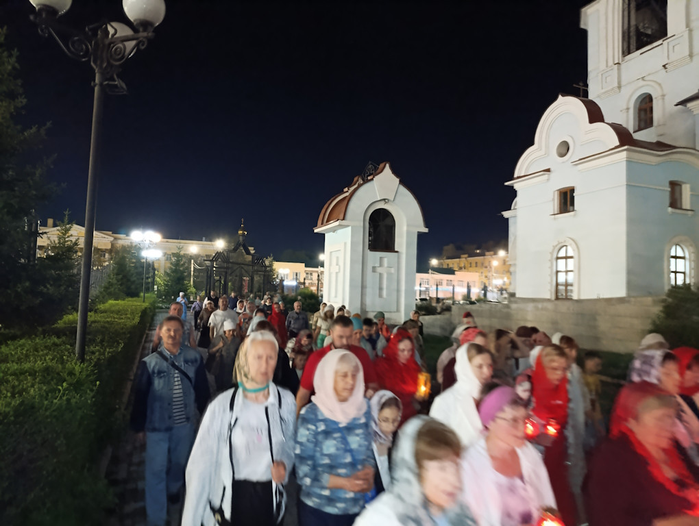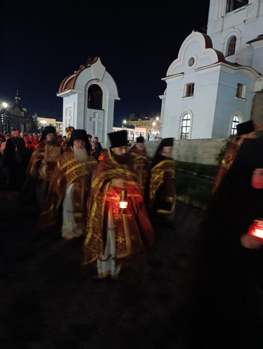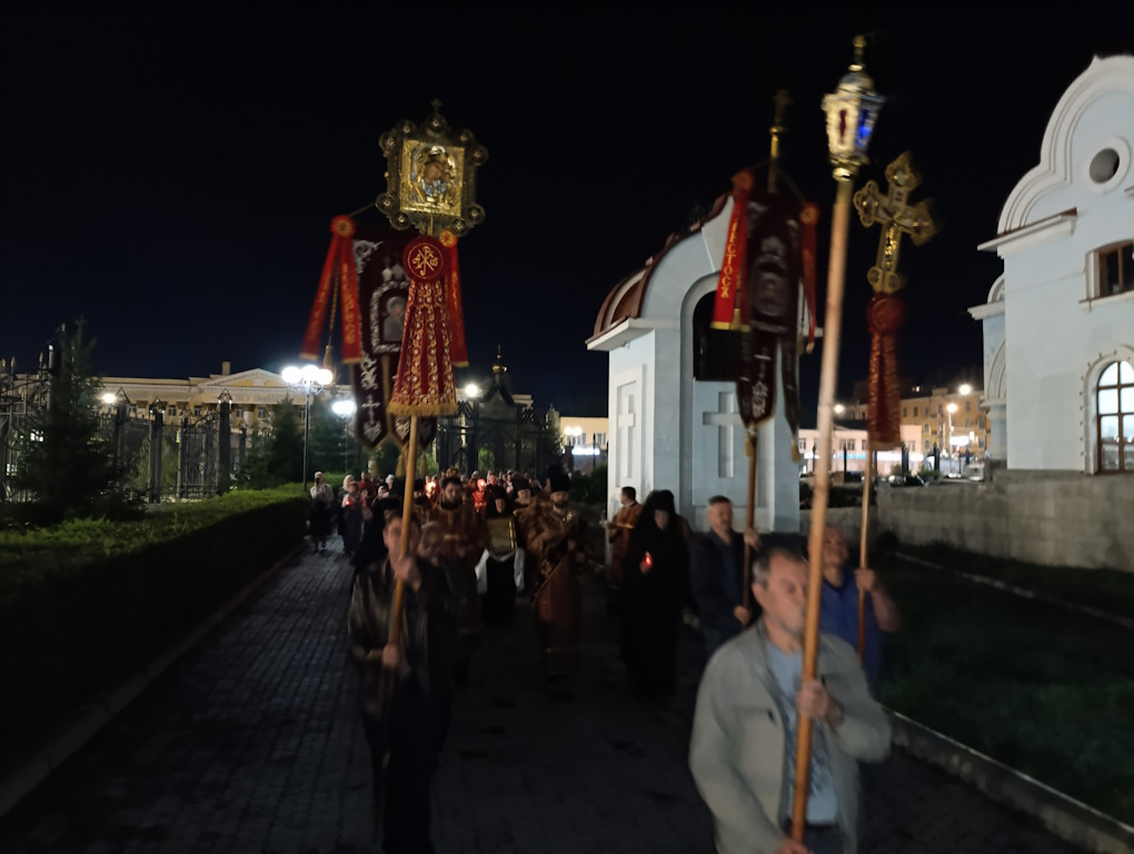 По окончании Литургии было совершено славление святым Царственным страстотерпцам и крестный ход вокруг кафедрального собора.