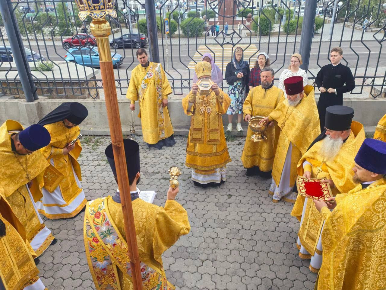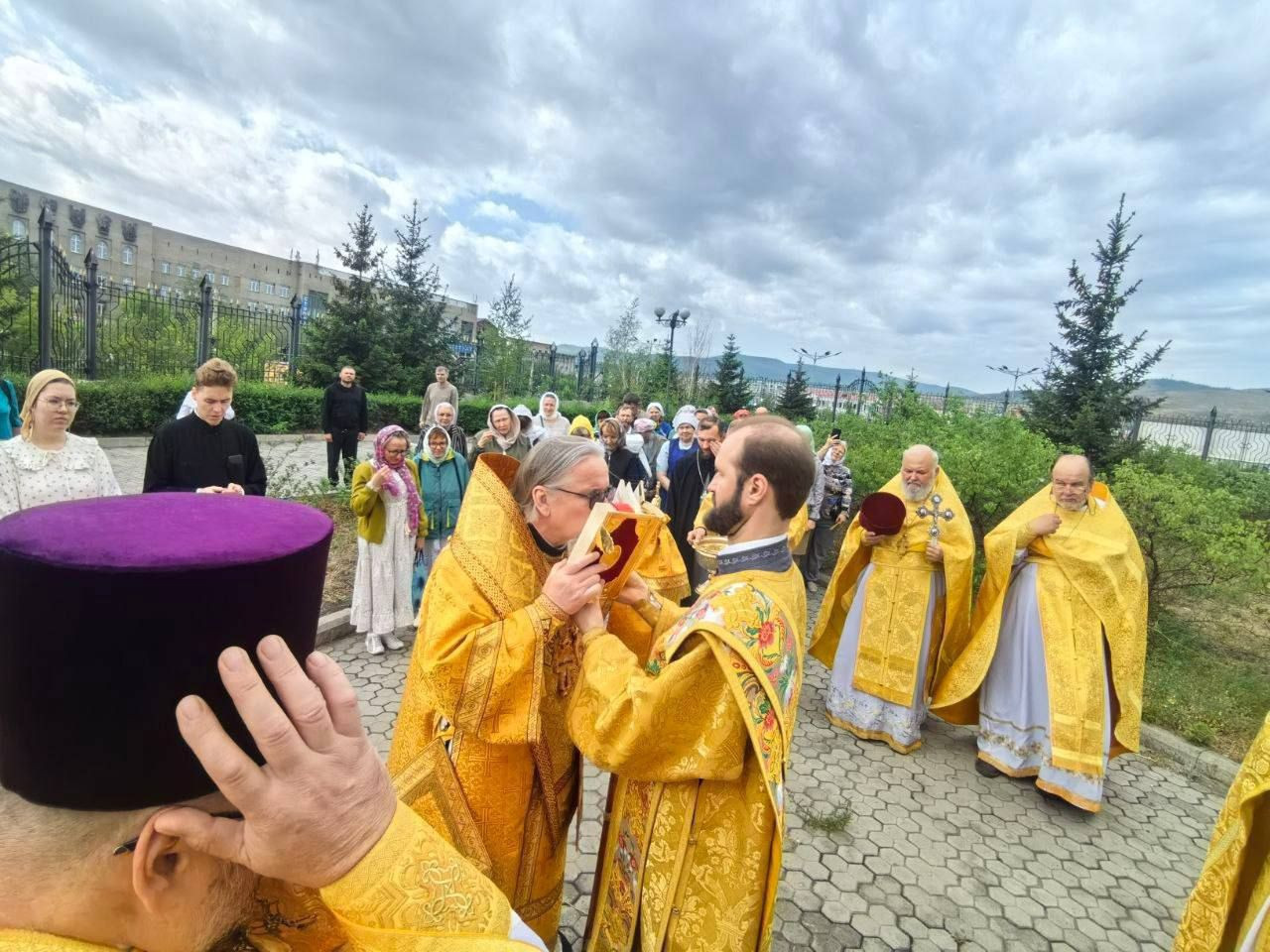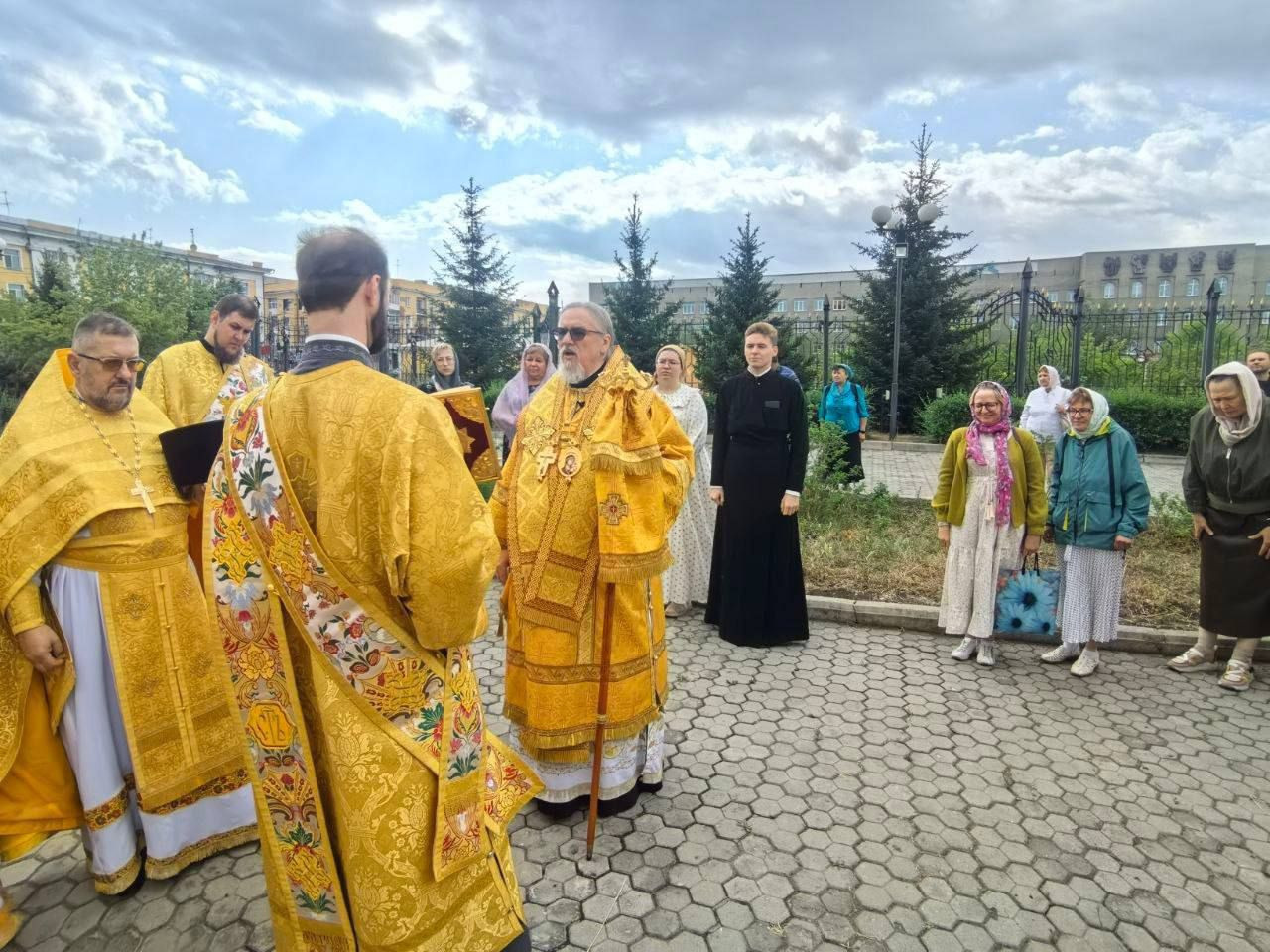 После Божественной литургии, владыка возглавил крестный ход вокруг храма сопровождаемый особыми прошениями и молитвами о ниспослании дождя.