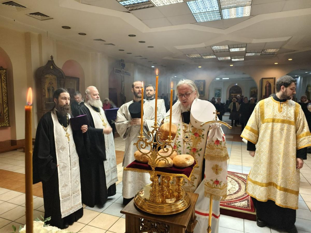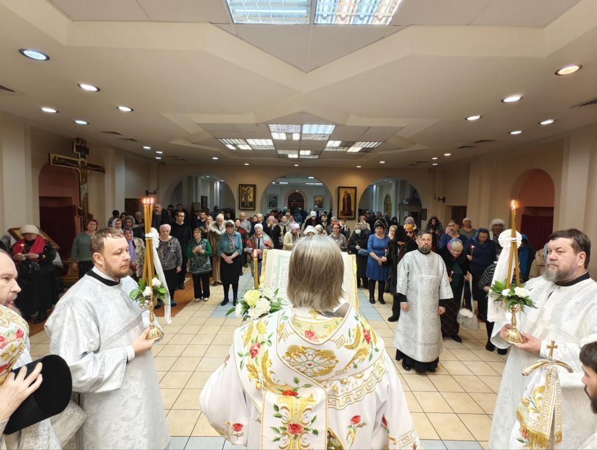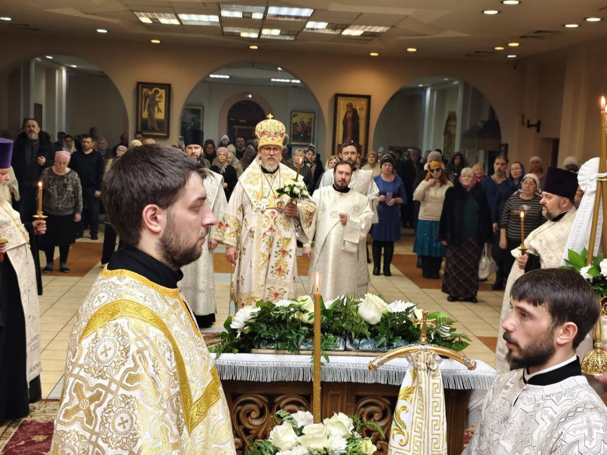 За всенощным бдением были совершены вечерня, лития с освящением хлебов, вина и елея и утреня с чтением Евангелия и помазанием всех молящихся освященным елеем.
