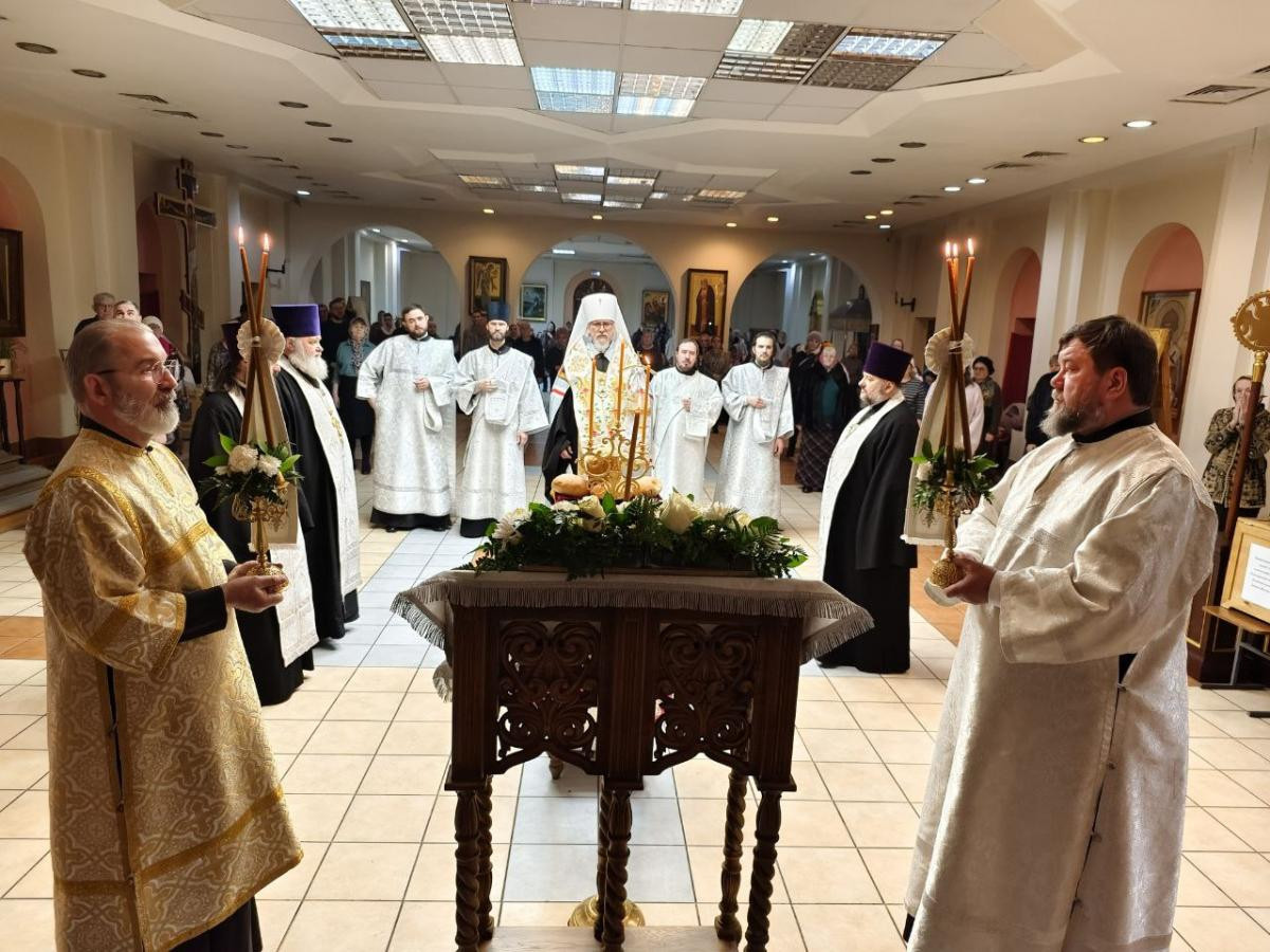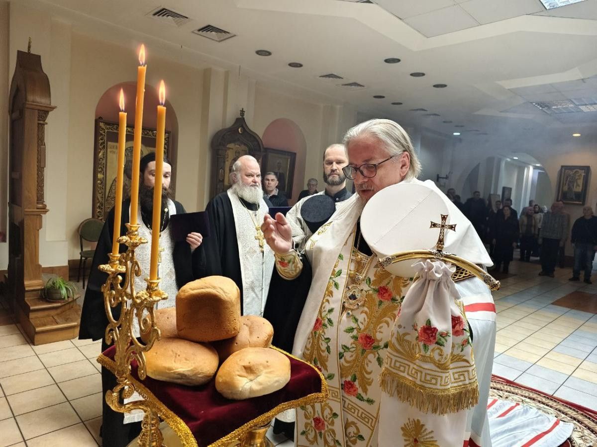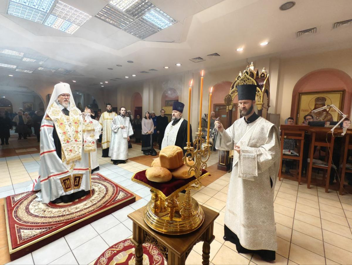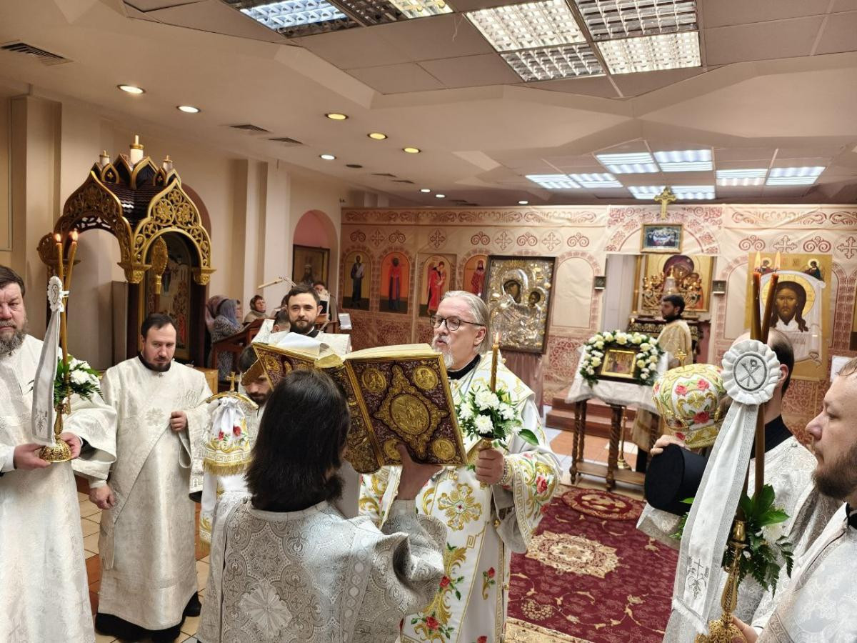 За всенощным бдением были совершены вечерня, лития с освящением хлебов, вина и елея и утреня с чтением Евангелия и помазанием всех молящихся освященным елеем.