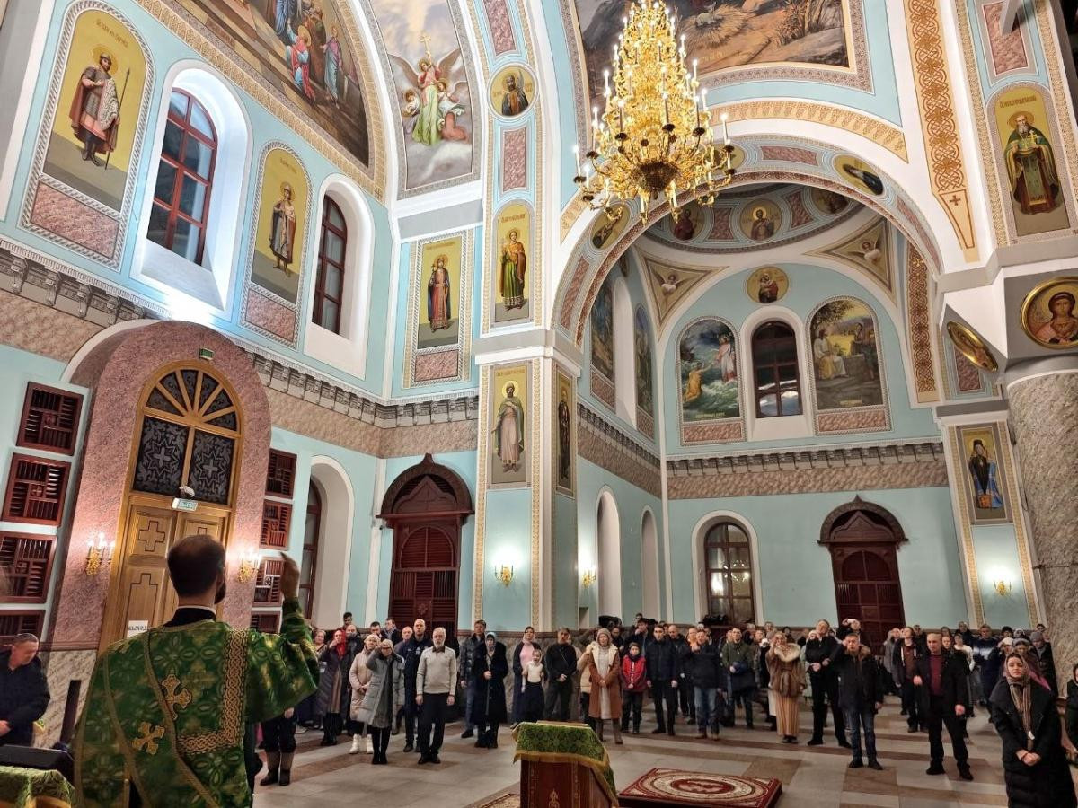 По благословению Святейшего Патриарха Московского и всея Руси Кирилла на сугубой ектении были вознесены особые прошения и молитва о Святой Руси, а также митрополит Димитрий прочитал молитву на новолетие.