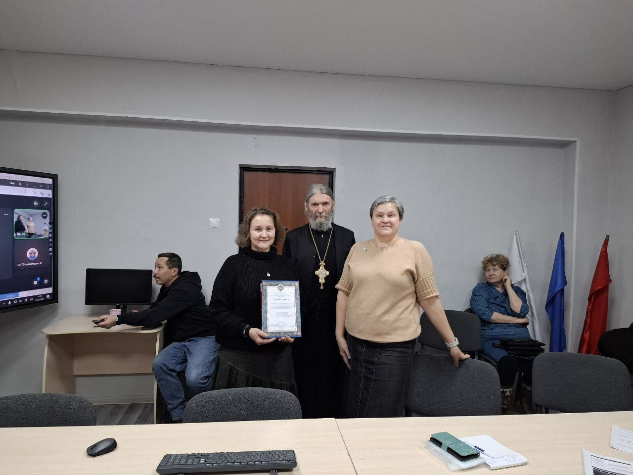 Лучшим примером такой трансляции стало присутствие на площадке победителей педагогических конкурсов в 2025 году – регионального этапа Всероссийского конкурс в области педагогики, работы с детьми и молодежью до 20 лет «За нравственный подвиг учителя» А.М. Гагариной (учитель истории и обществознания МБОУ СОШ №1 г.Читы, Гран-при конкурса за работу «Патриотизм – имя собственное. Воспитательный потенциал этнорегиональногокомпонента в учебно-исследовательской и проектной деятельности школьников» в номинации «За организацию духовно-нравственного воспитания в образовательной организации» ) и Е.Г. Иманаковой, педагога МБУ ДО «Детская музыкальная школа №4» г. Читы, канд. культурологии (I место в номинации «Лучшая методическая разработка в предметных областях «Основы религиозных культур и светской этики» (ОРКСЭ), «Основы духовно-нравственной культуры народов России» (ОДНКНР), «Основы православной веры» (для образовательных организаций с религиозным компонентом» за работу «Мемо по-забайкальски: региональный компонент в духовно-нравственном воспитании детей и взрослых»), а также одного из победителей Конкурса-смотра успешных образовательных практик по реализации учебного курса «Основы религиозных культур и светской этики» в 2025 году Осороновой Светланы Александровны, учителя начальных классов МОУ «СОШ № 3 п.Дарасун», Карымский район, представившей разработку урока ОРКСЭ по теме «Россия – наша Родина».