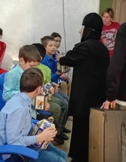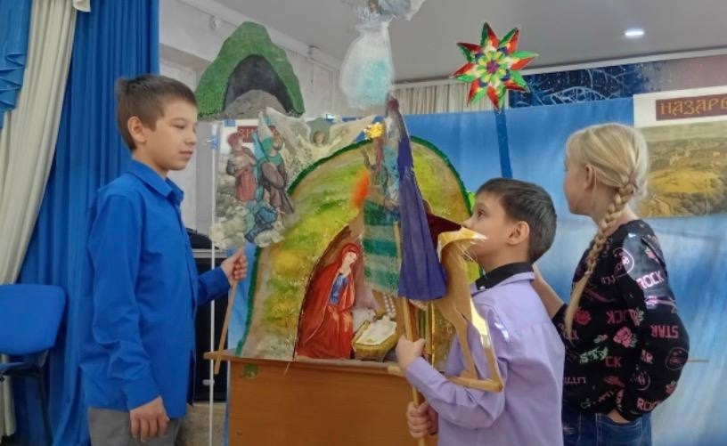 Сестры привезли передвижной вертеп и кукол для праздника. Дети с радостью представляли себя в роли пастухов, волхвов, ангелов и Вифлеемской звезды.