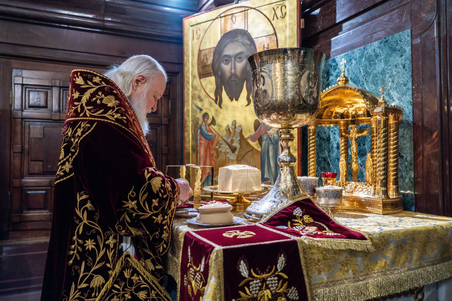 По прибытии в храм перед началом богослужения Предстоятель Русской Православной Церкви поклонился мощам святителя Филарета, митрополита Московского.