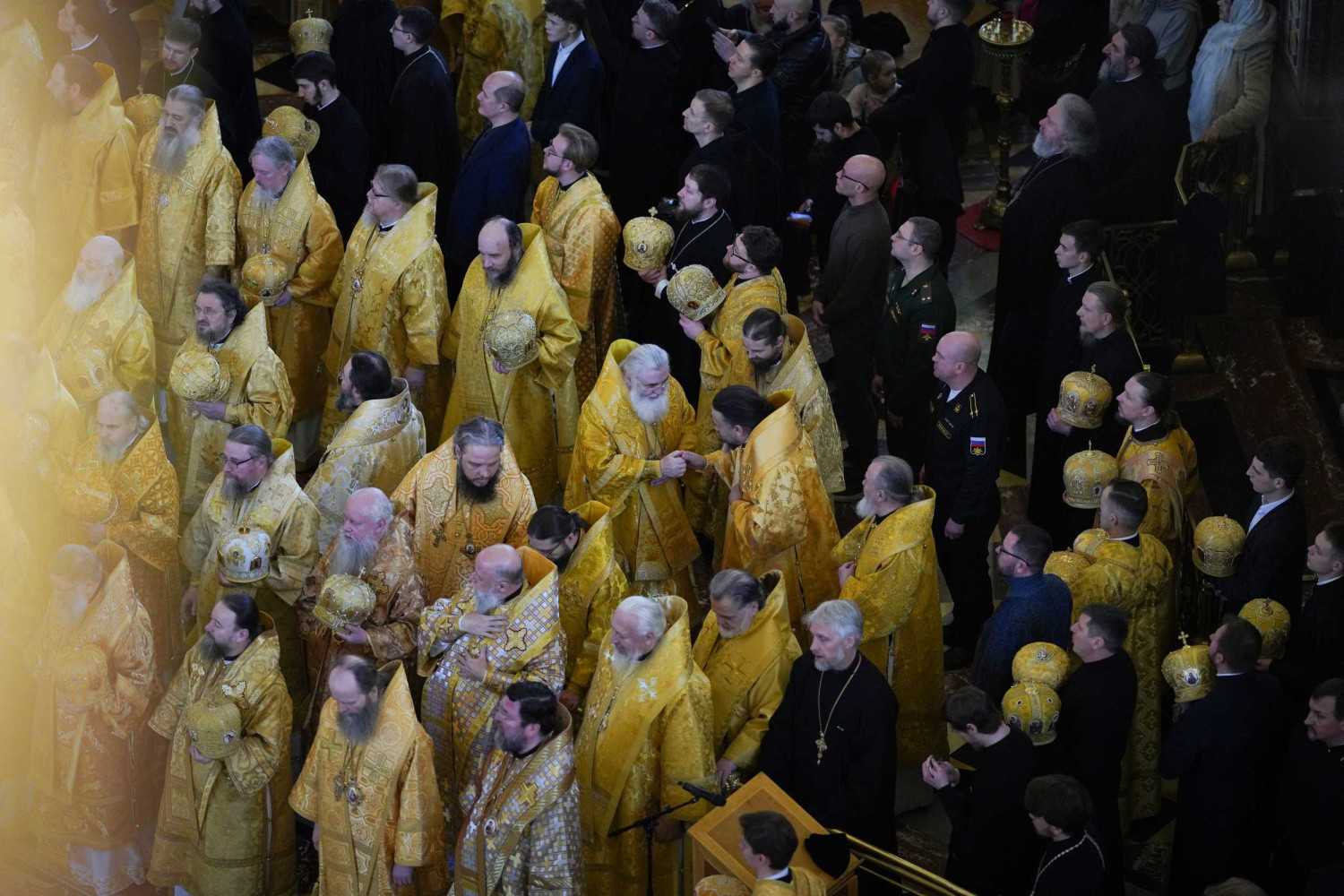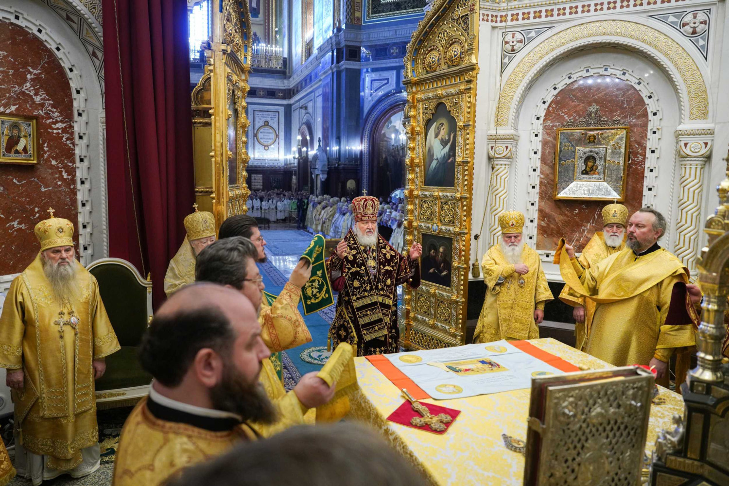 В этот знаменательный день Святейший Патриарх Кирилл совершил Божественную литургию в кафедральном соборном Храме Христа Спасителя в Москве в интронизационных облачениях и с копией жезла святителя Петра.