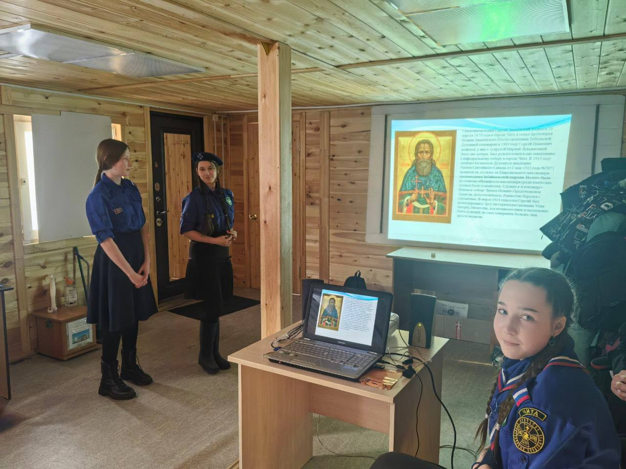 Встреча началась с общего построения, сдачи рапорта и молитвы . Мы пропели тропарь и кондак нашему небесному покровителю — священномученику Сергию Знаменскому.