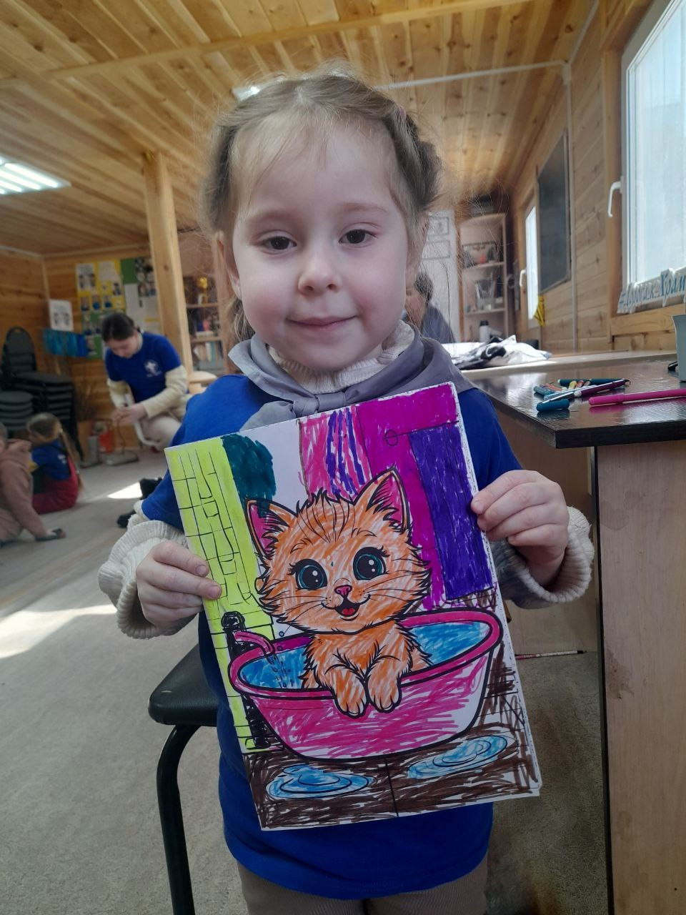 А самые маленькие следопыты — Анастасия Сергеевна и Александра сдали зачет по разукрашиванию кота