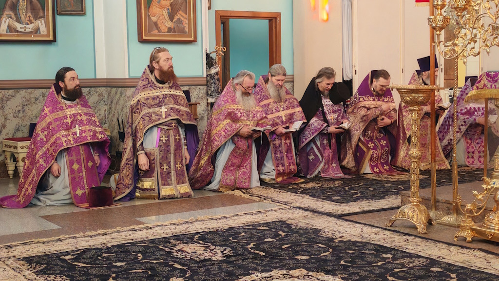 Перед Литургией были совершены уставные великопостные богослужения — часы, изобразительны и вечерня.